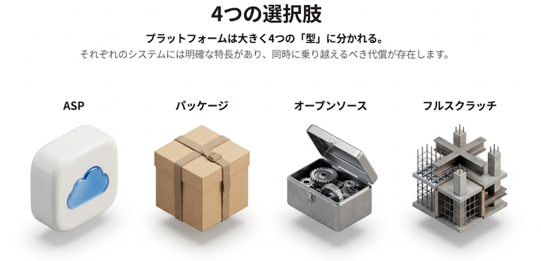 ECサイトを支えるプラットフォームは、一見すると複雑に見えますが、大きく整理すると四つの型に分類して考えることができます。